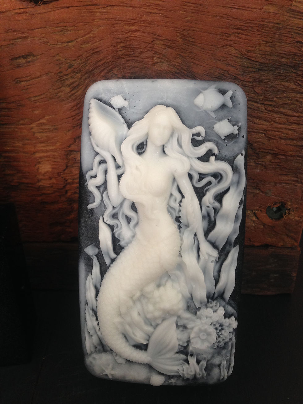 I gave my eldest daughter Ariel a piece of an "oops" soap that I made and she kept telling me that whenever someone came over, they would comment on how much they loved that piece of broken soap. So I thought I would make her a special soap, something just for her. I made her this beautiful mermaid soap that I really had not given much thought about selling, but people were commenting how pretty it was and that I should sell it. So I made a few more and they sold quickly at the market. Now it is the most popular custom ordered soap that I make. Although I have made it in different colours black still remains my personal favourite.